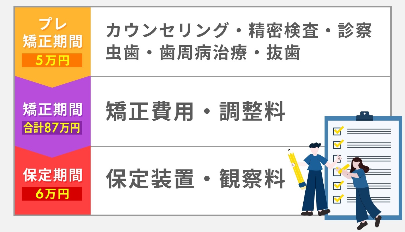 一般的に総額に含まれる費用は検査料、装置料、調整料、保定装置料です。別途必要になりがちな費用として、抜歯料、追加装置料、治療期間延長に伴う費用があります。