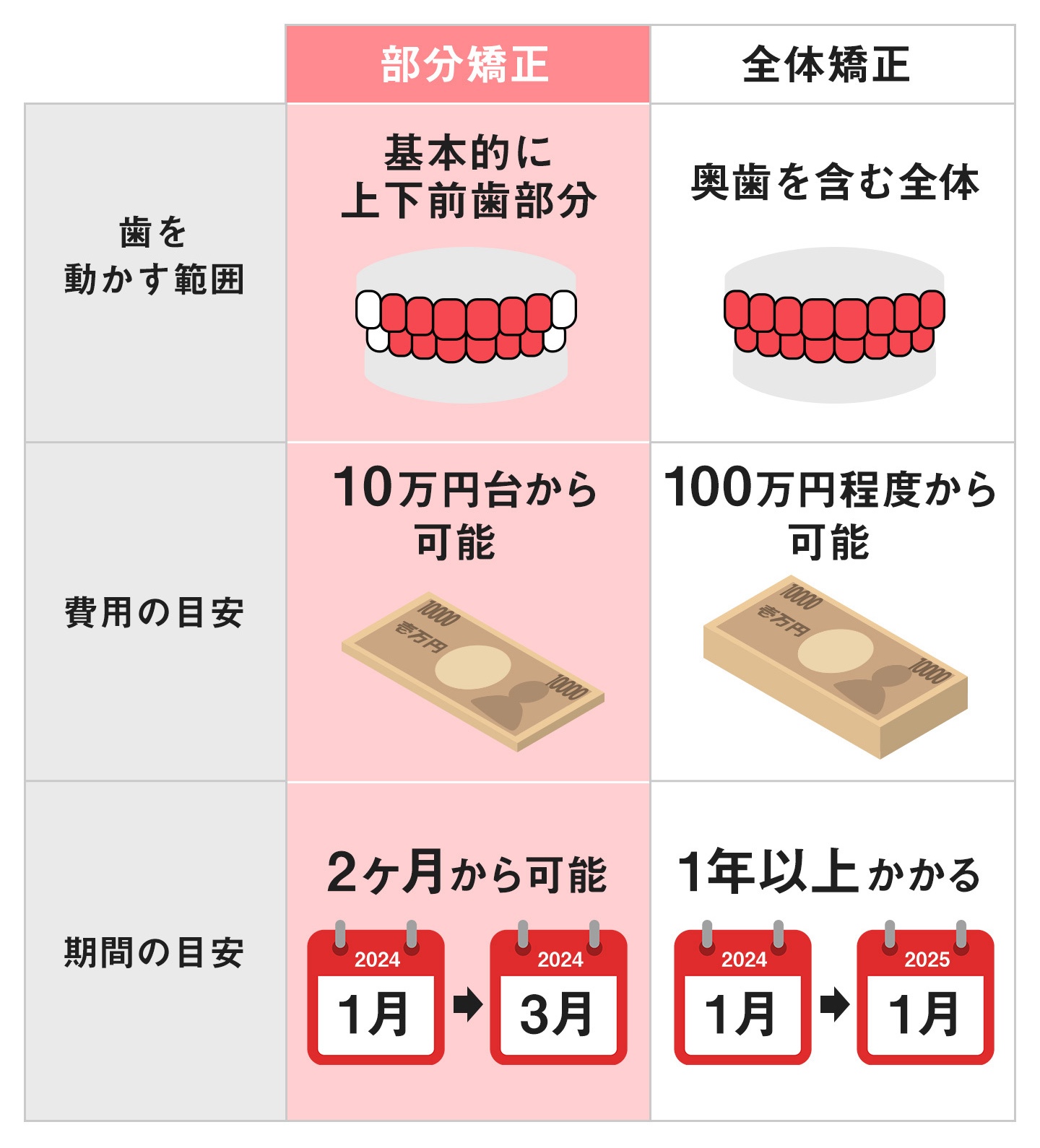 部分矯正は前歯の歯並びを中心に整える治療で、軽度のすきっ歯、前歯のがたつき改善に適用されます。治療期間は3~6ヶ月と短く、費用も20万円~50万円と比較的リーズナブルです。